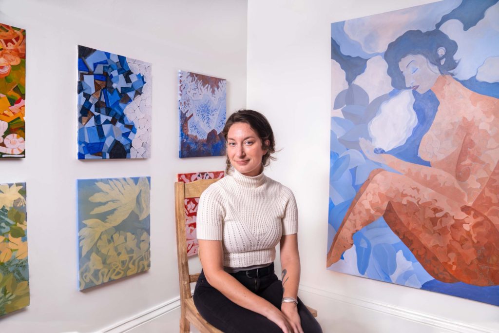 A female painter sitting in front of her art gallery in a New Orleans art studio