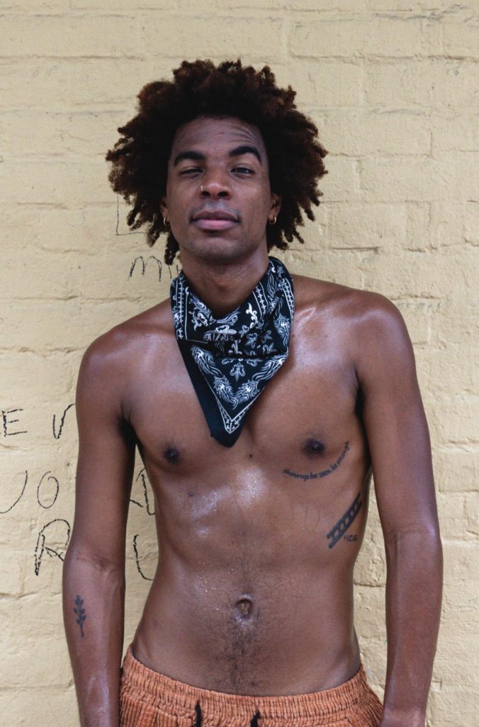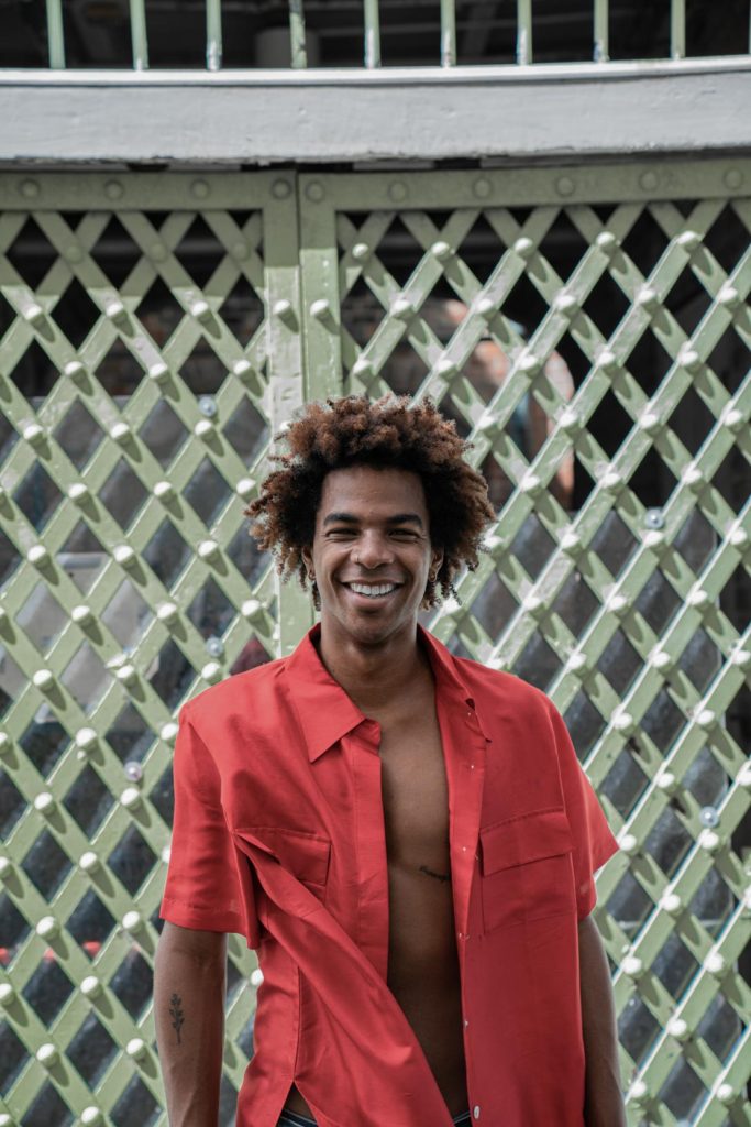 A shirtless model and dancer smiling along a green gate in the New Orleans French Quarter