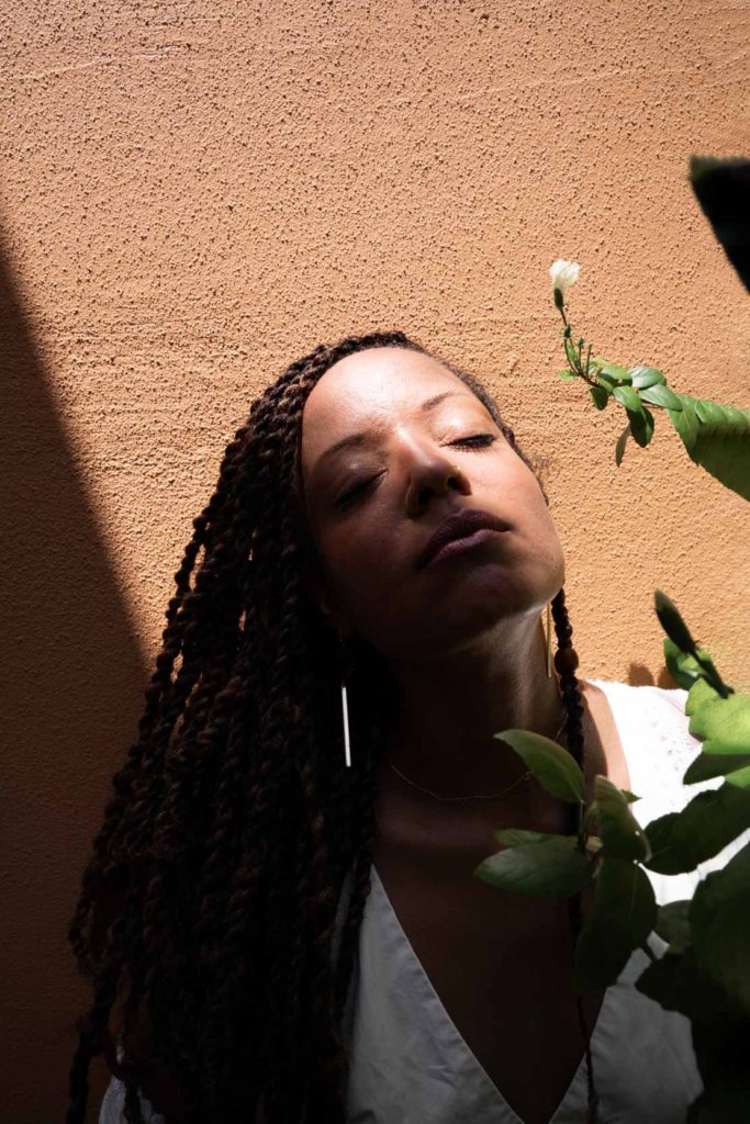 Woman relaxing and meditating in the shade against rustic orange wall in New Orleans City Park Botanical Garden