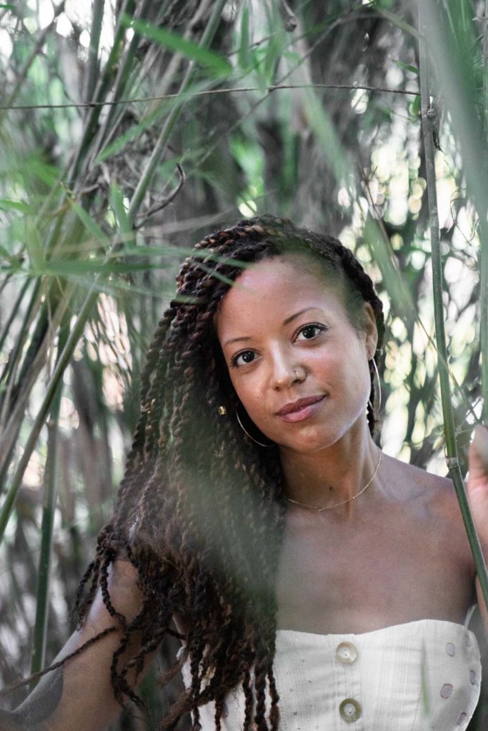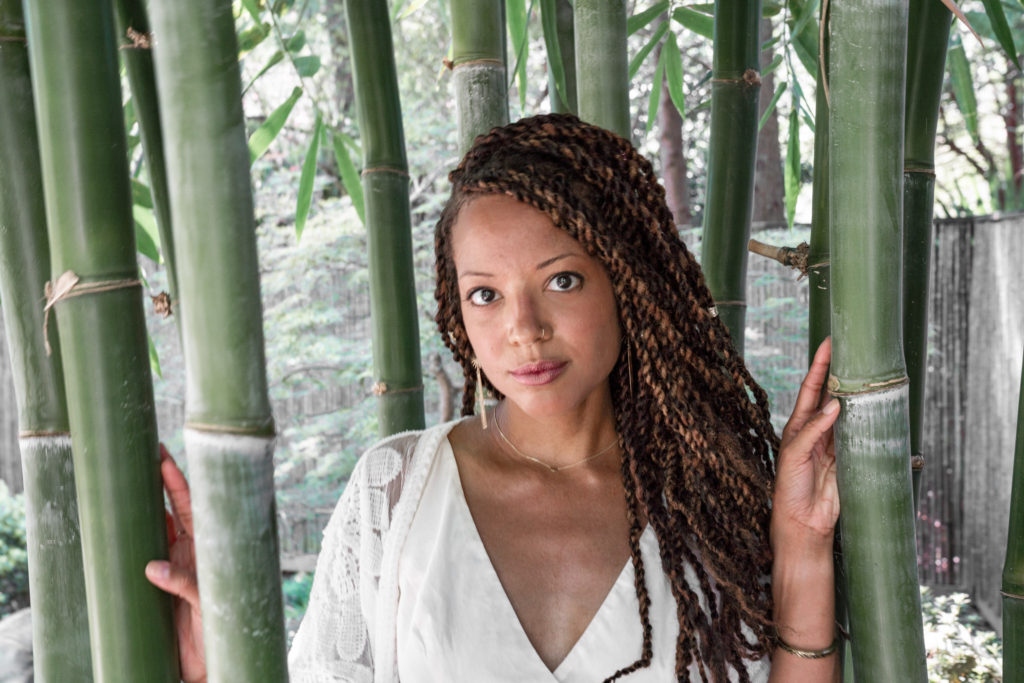 a woman modeling in a garden of bamboo trees in the New Orleans City Park Botanical Garden