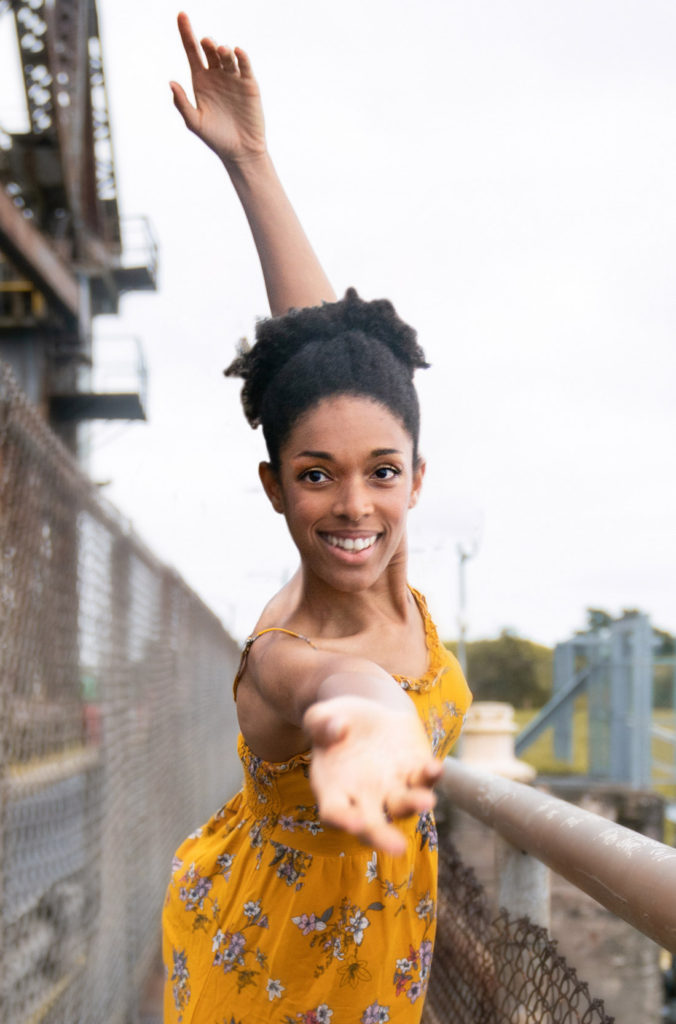 A female dancer wearing leotard smiling on a street in New Orleans