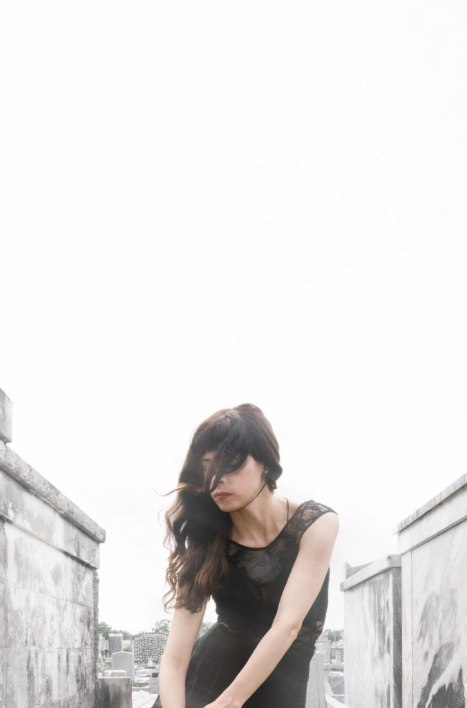 A woman reflecting in a New Orleans cemetery with her hair blowing in the wind