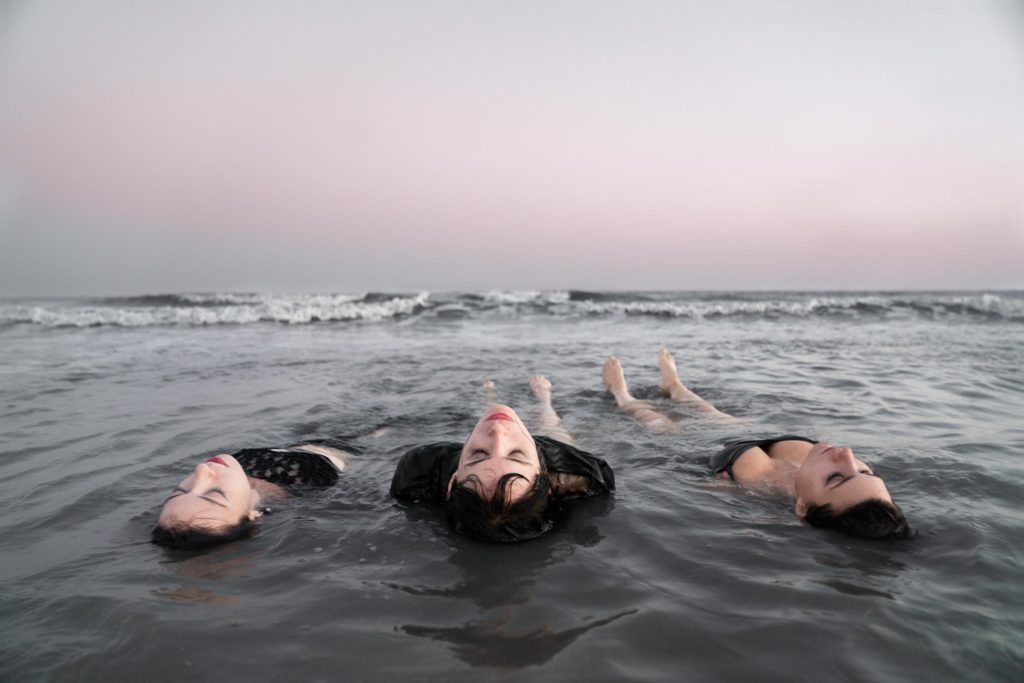 Female dancers laying in the ocean on a Louisiana Gulf Coast beach at sunset