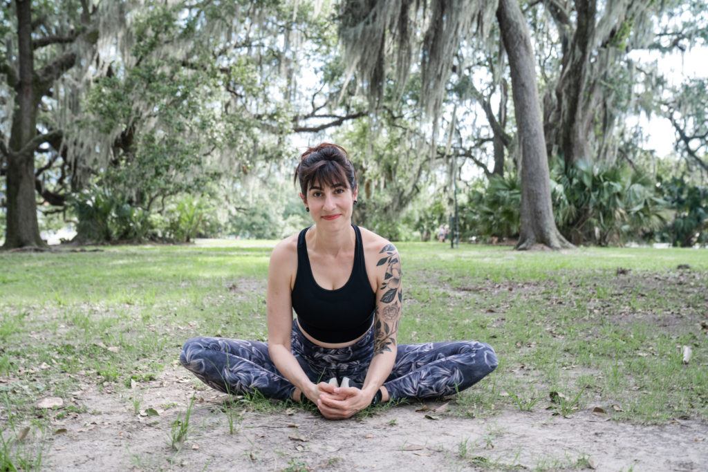 a yoga teacher posing and smiling in New Orleans City Park